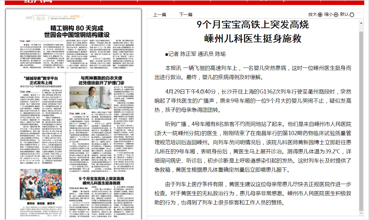 【绍兴晚报】9个月宝宝高铁上突发高烧 嵊州儿科医生挺身施救
