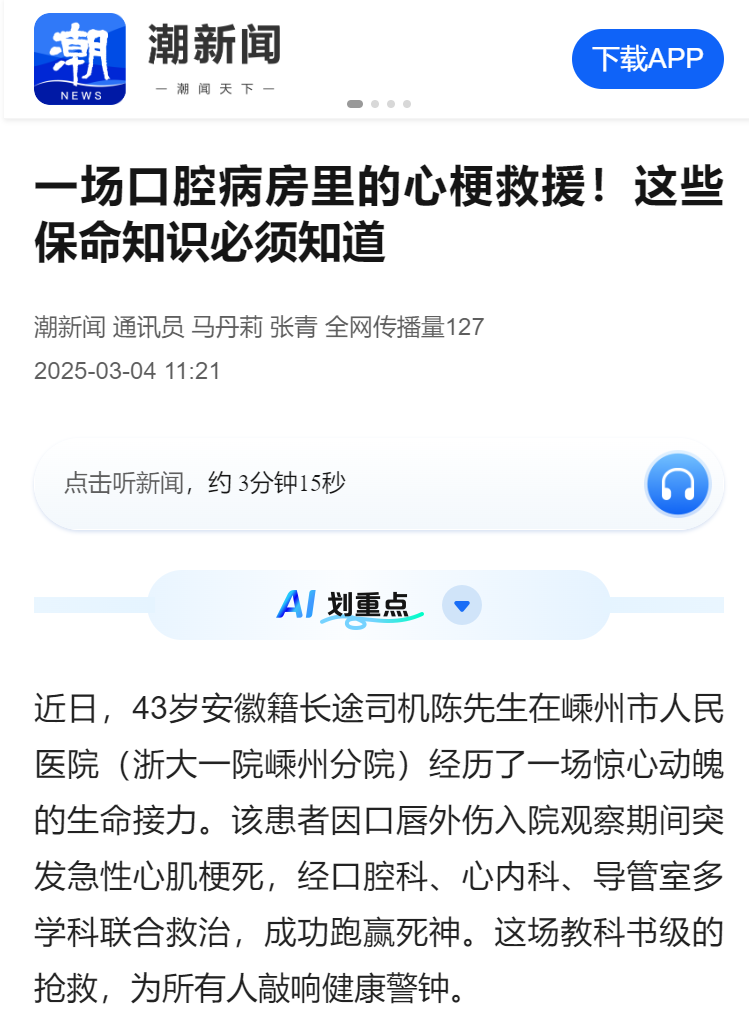 近日,43岁安徽籍长途司机陈先生在嵊州市人民医院(浙大一院嵊州分院)经历了一场惊心动魄的生命接力。该患者因口唇外伤入院观察期间突发急性心肌梗死,经口腔科、心内科、导管室多学科联合救治,成功跑赢死神。这场教科书级的抢救,为所有人敲响健康警钟。