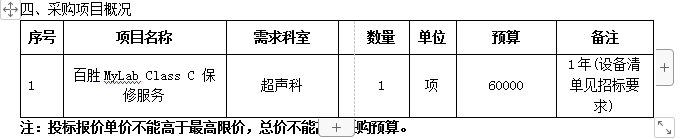 根据我院临床科室发展和医疗设备维护保养需要,现需采购一项百胜MyLab Class C 保修服务,请符合资质的供应商积极参与。