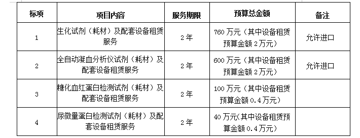 3.预算金额:标项一:760万元(2年),其中设备租赁预算价2万元(2年);标项二:600万元(2年),其中设备租赁预算价2万元(2年);标项三:100万元(2年),其中设备租赁预算价0.4万元(2年);标项四:40万元(2年),其中设备租赁预算价0.4万元(2年)。