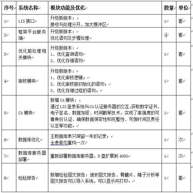 我院为了保证检验系统稳定运行,需要对LIS服务器进行重新部署,升级LIS接口,优化前处理、审核模块;对检验系统进行CA电子签名认证,确保检验报告的保密性和完整性。详细功能技术参数如下: