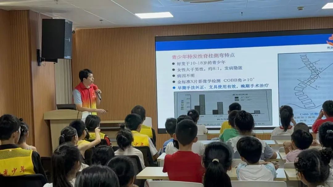 嵊州市第五届志愿服务和文明实践项目《关爱“民族脊梁”——青少年脊柱侧弯防治科普》由嵊州市委社会工作部主办、嵊州市医路先锋志愿服务协会承办,项目成员由一批优秀的康复医师、康复治疗师、脊柱骨科医师组成。2024年8月15日,项目负责人苏浩亮携康复医师来到鹿山街道党群服务中心,为正在暑假期的小朋友们开展了一堂生动有趣的“课外辅导”。