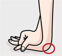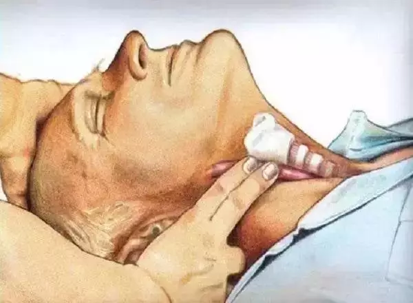 食指、中指找到气管,两指向近侧下滑到气管与胸锁骨突肌之间的沟内。