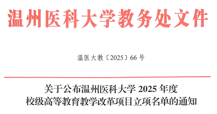 2025年9月8日,温州医科大学下发2025年度高等教育教学改革项目立项名单,项目建设周期为2年。