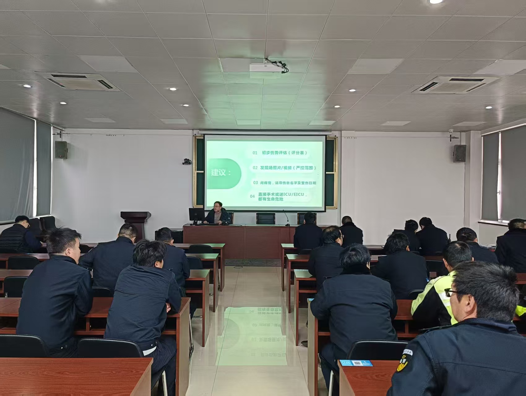 在活动现场,首先,由创伤中心执行副主任过宓主任医师授课——《创伤预防及现场急救》,讲解了各种场景下易发生的创伤事件及预防措施、现场急救要点。并介绍了PHI、TI、GCS三种常用的创伤评分表、如何区别严重创伤病人和普通创伤病人。