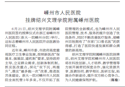【健康报】嵊州市人民医院 挂牌绍兴文理学院附属嵊州医院