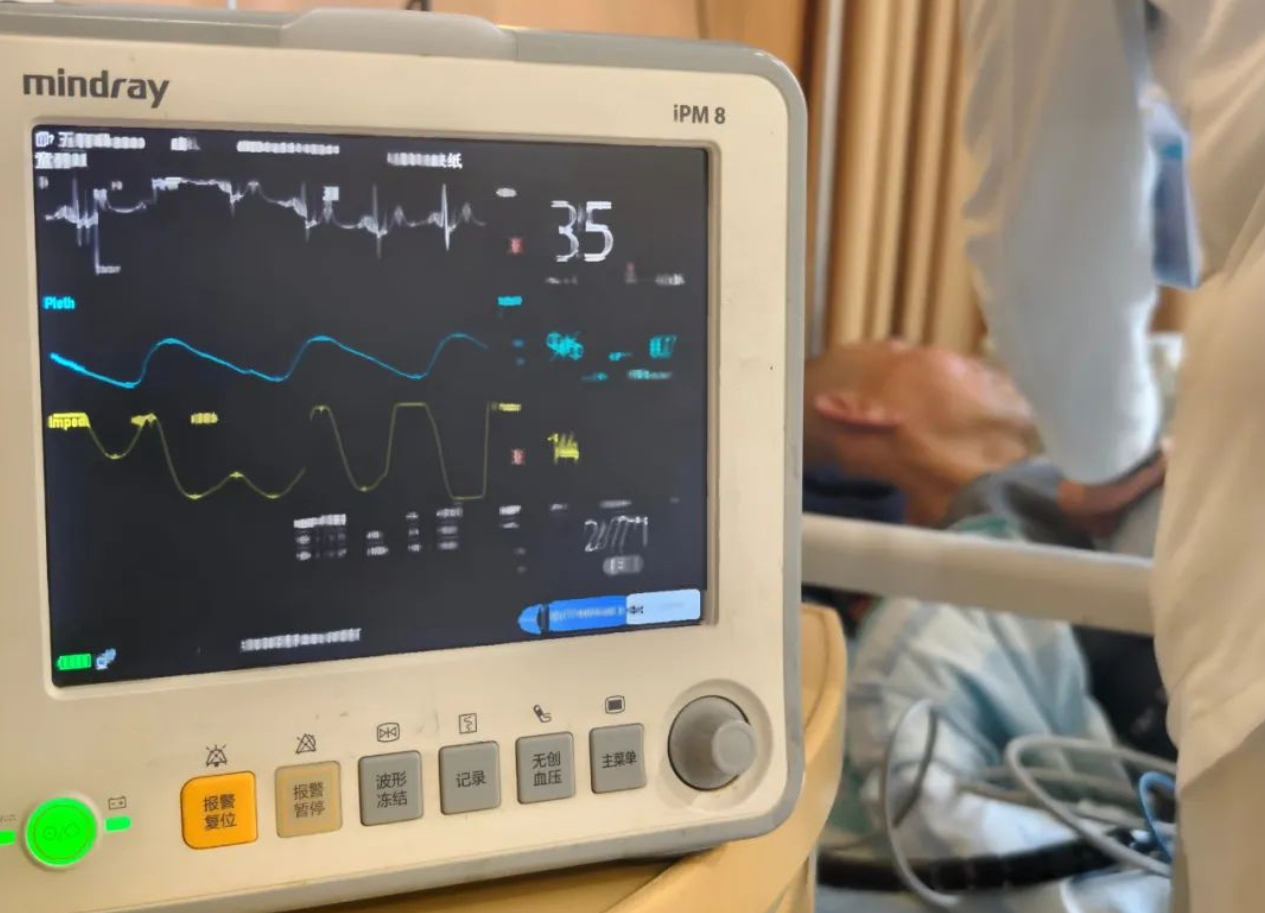 傍晚17:44:护士站中央监护系统突然发出刺耳警报......患者心率骤降至35次/分,血压暴跌至71/39mmHg!值班护士黄英闻声立即大声呼叫值班医生,同时立即冲向病房,护士长马丹莉听到呼叫后也跟值班医生一起在最快时间内抵达患者床旁,迅速评估患者意识,气道及循环状态,完成心电图检查,明确诊断为“急性下壁心肌梗死”,当即启动院内胸痛中心急救流程。最惊险的是,此时的陈先生仍旧没有胸闷胸痛等不适症状,由于老家在安徽,家属不在身边,只有朋友陪同,医生护士一边安抚陈先生,一边紧急联系其家属。