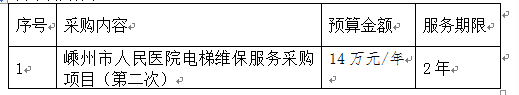 根据我院需要,计划对嵊州市人民医院电梯维保服务进行采购,请符合资质的供应商积极参与。