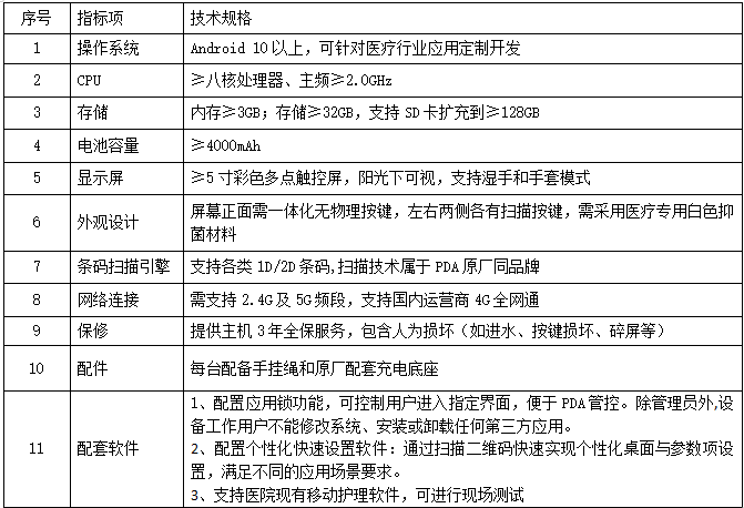 PDA须满足病区运行的日常工作要求。详细功能技术参数如下: