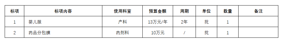 按照医院后勤物资采购计划,现需采购一批婴儿服和药品分包膜等物资,请符合资质的供应商积极参与。